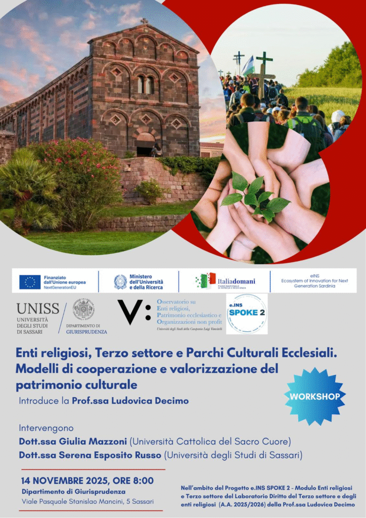 L’incontro si terrà il 14 novembre 2025, alle ore 08:00, presso il Dipartimento di Giurisprudenza dell’Università degli Studi di Sassari. Il workshop è organizzato nell’ambito del progetto “e.INS SPOKE 2” e riguarda il tema degli enti religiosi, del patrimonio ecclesiastico e delle organizzazioni non profit, con una particolare attenzione al diritto del terzo settore.