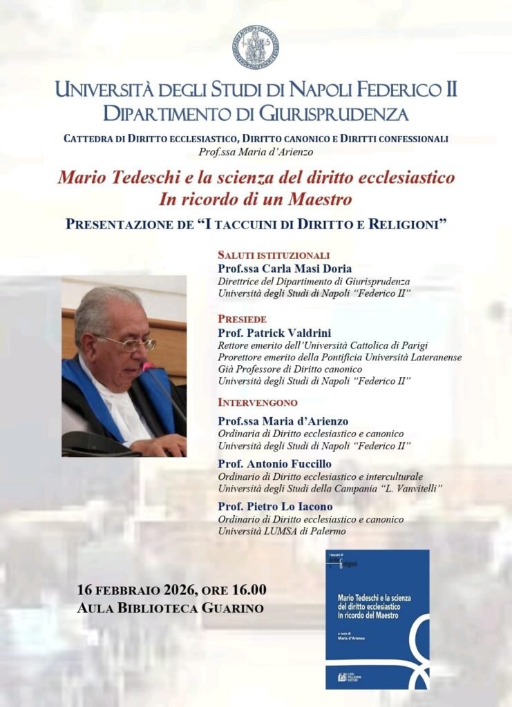 Il convegno “Mario Tedeschi e la scienza del diritto ecclesiastico: In ricordo di un Maestro” si terrà il 16 febbraio 2026 alle ore 16.00 presso l’Aula Biblioteca Guarino dell’Università degli Studi di Napoli Federico II. L’evento è dedicato a ricordare il Professore Mario Tedeschi, figura di grande rilievo nel campo del diritto ecclesiastico, e a celebrare il suo impatto duraturo su questa disciplina.
